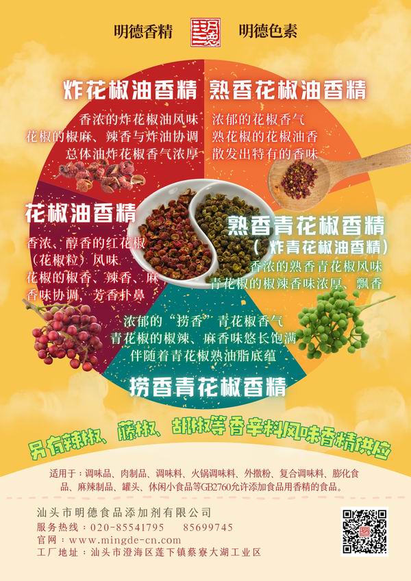 明德 花椒香精 細(xì)分為 紅色的花椒風(fēng)味,綠色的青花椒風(fēng)味,炸花椒風(fēng)味等等。